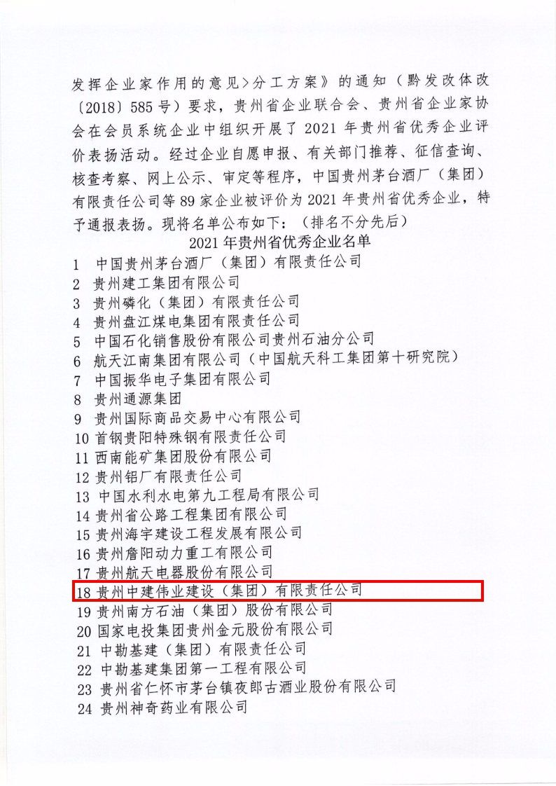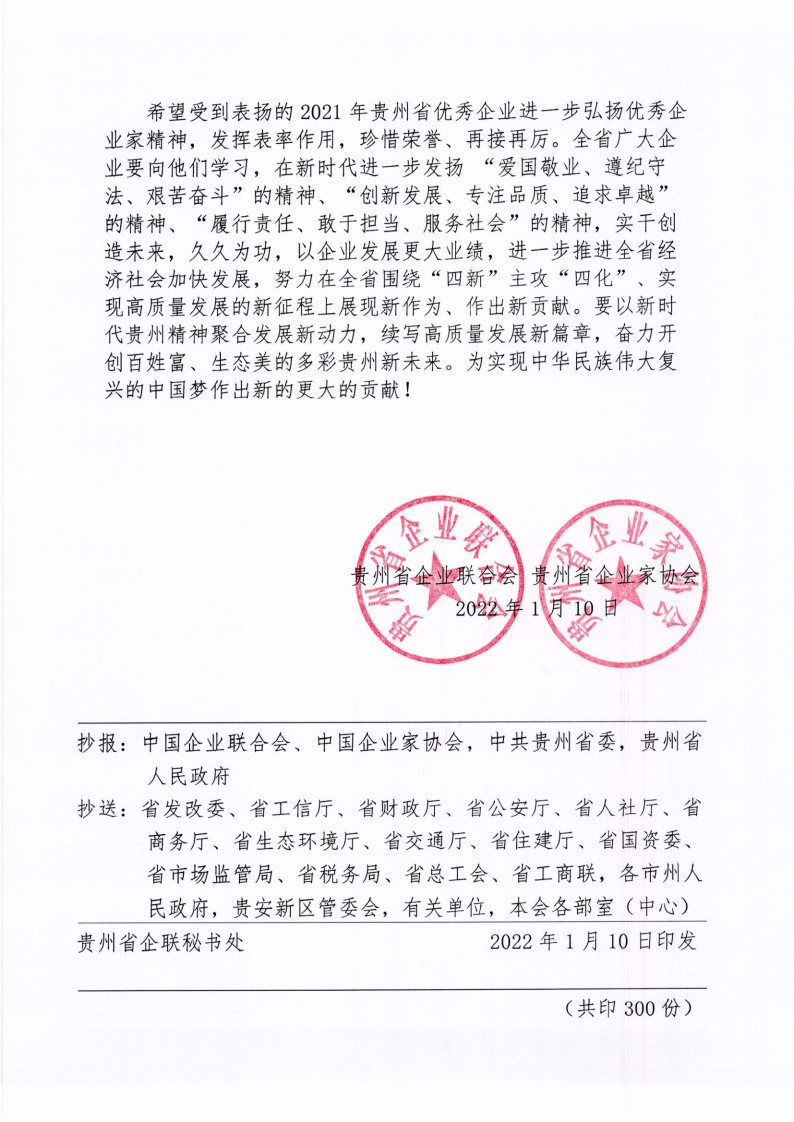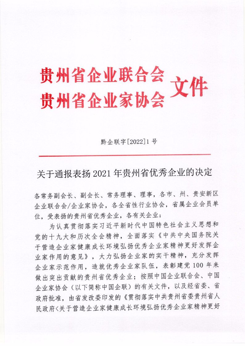 2022年1月10日,贵州省企业联合会、贵州省企业家协会印发《关于通报表扬2021年贵州省优秀企业的决定》,葡京赌app客户端被授予“贵州省优秀企业”荣誉称号。