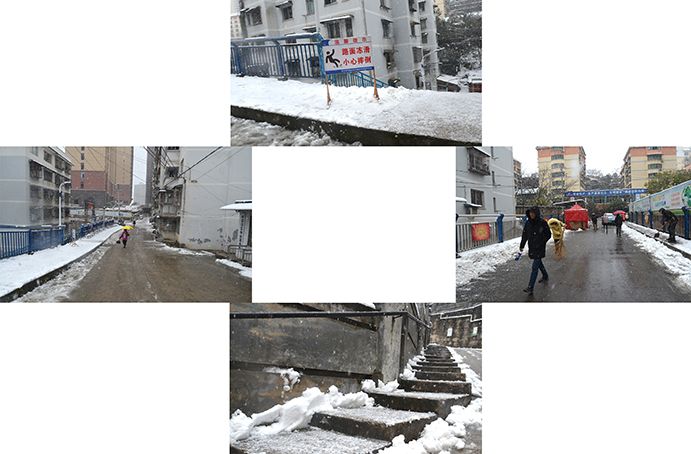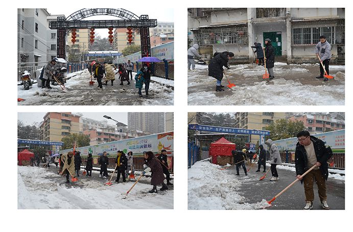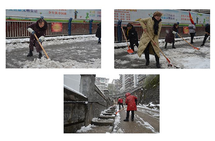 各攻坚队带领队员手拿铁锹竹帚提示牌,分组前往苹果山花园1-3号楼、州建社区、文化南路道路两侧、石阶步道等处,沿着道路对沉垫在人行道上的厚厚积雪进行清除,此次积雪远比前两次厚重许多。志愿者们迎着大雪纷飞,用热情行动融化持续飘落在脸颊上的雪花,清扫出1公多里长3米宽的社区道路和沿街步道,保障了市民群众和社区居民安全畅行。