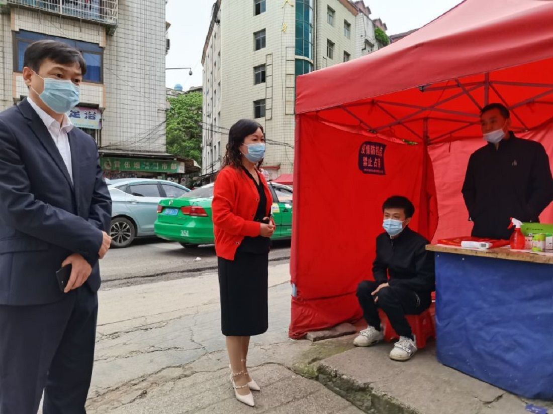 王莉一行先后检查了州建商场两个主要出入口的防疫点设置情况、值班人员安排和防疫物资配备情况,听取了物业公司党支部书记、董事长巫宿琴及商场分管副经理闵毅汇报州建商场的基本情况及疫情防控工作。王莉对辖区的疫情防控工作给予了肯定,对存在的不足提出了整改意见。