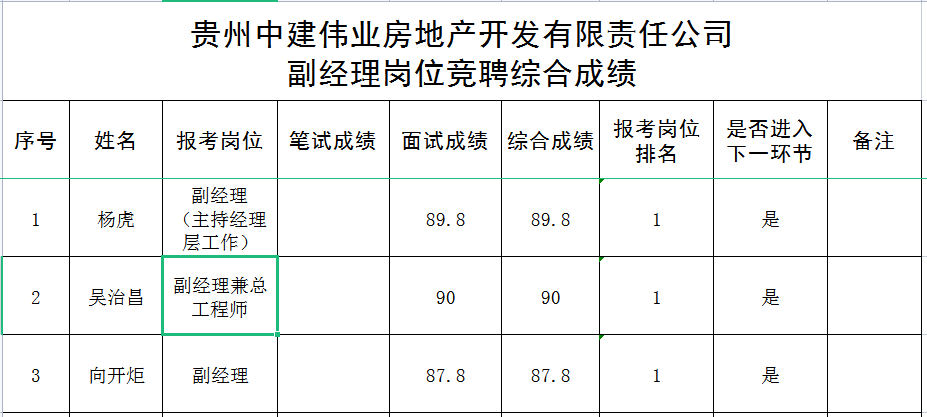 附件:贵州新澳门葡京赌场app伟业房地产开发有限责任公司副经理岗位竞聘综合成绩