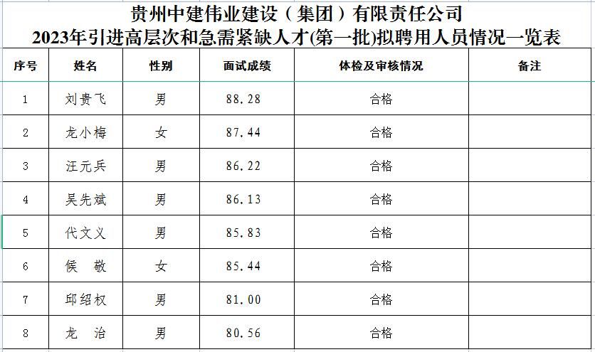 根据《贵州葡京赌app客户端伟业建设(集团)有限责任公司高层次人才和急需紧缺人才引进工作方案》,经报名、资格审查、面试、体检和考察等程序,刘贵飞等八位同志列入贵州葡京赌app客户端伟业建设(集团)有限责任公司2023年引进高层次和急需紧缺人才(第一批)拟聘用对象(详见附件),现予以公示。